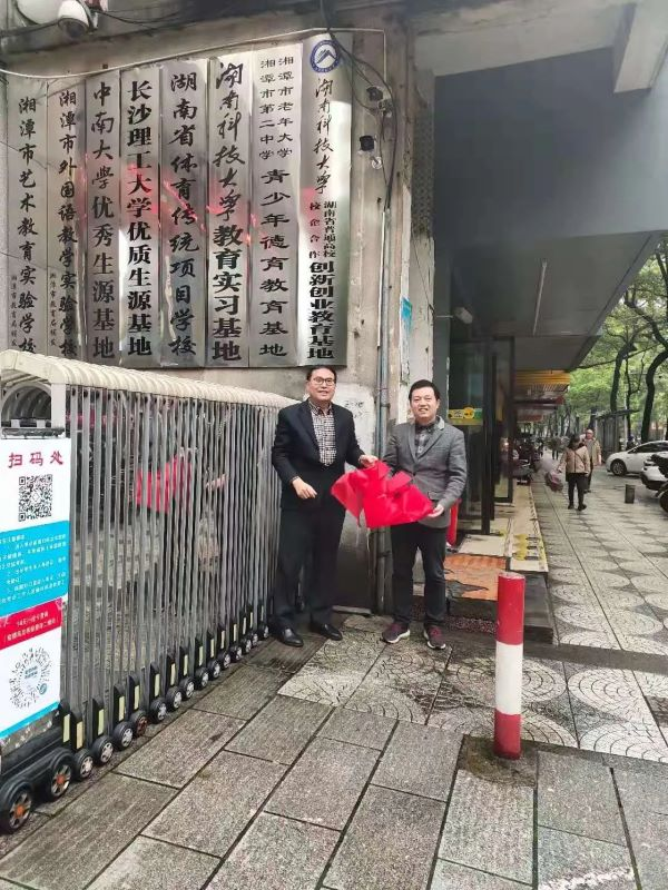 在二中门口,聂志军教授与唐新球校长代表双方喜揭红绸,共同完成揭牌仪式,湘潭市二中正式成为“威廉williamhill中文官网大学生创新创业基地”。这是一次威廉williamhill中文官网与二中融通融合,创新发展的良好契机,将开启双方友好往来、通力合作的新篇章。