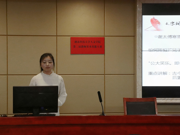颁奖结束后,就进入了“说课”技能竞赛的环节。首先登场的是17级汉语言文学专业的余洁同学,她选择说课的篇目是郁达夫《故都的秋》。她沉着冷静地分析了文章的总体情况,接着向在场的观众讲解了她教学时准备重点把握的文章语言和其表达的情感这两部分。最后她表示,会让学生开展拓展学习,课外欣赏《北国的秋天》这篇文章,并提示学生需要重点注意的部分。她的演说为整场比赛顺利且紧张的展开开了一个好头。