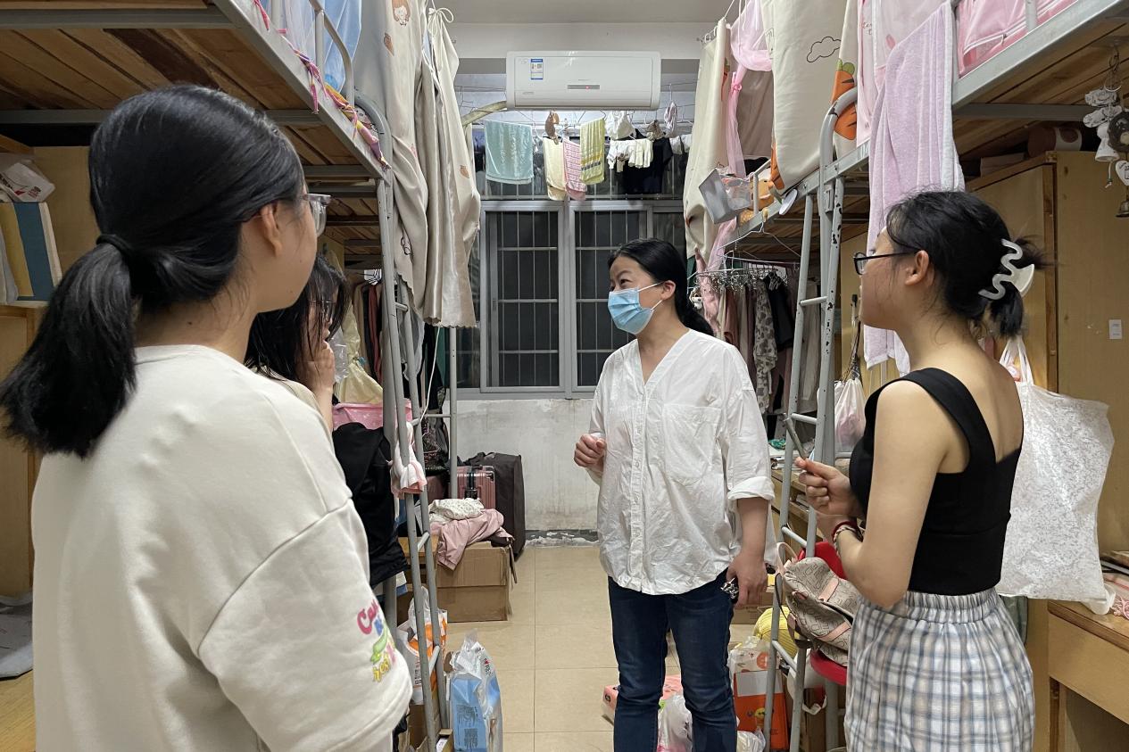 寝室中,罗振军关心学生健康问题,提醒学生做好个人防护,预防感冒,注重宿舍卫生情况,定期通风,经常清洁,尽量避免细菌滋生。为减少宿舍安全隐患,老师们就宿舍空调的使用、寝室用电安全与不使用大功率电器、不私拉电线等方面进行强调要求。此外嘱咐道:“夏季临近,大家要远离野外水源,警惕下河下江,保护自身安全。”正值学风建设月和考试月,老师们鼓励学生认真复习,加强学习管理,积极备考,营造良好的学习氛围。