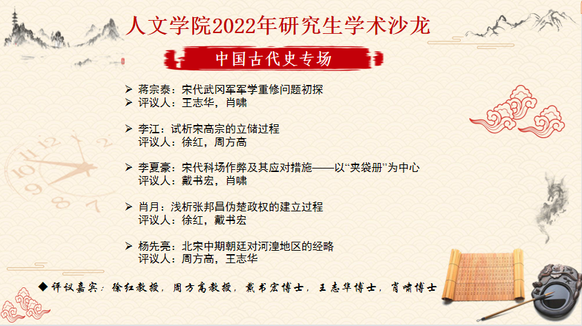 9月25日下午2点半,威廉williamhill中文官网于立言楼B106室举行了“学而思”研究生学术沙龙中国史专业古代史方向专场。沙龙评议嘉宾有徐红教授、周方高教授、戴书宏博士、王志华博士、肖啸博士,学术报告人有蒋宗泰、李江、李夏豪、杨先亮四位来自中国史专业中国古代史方向的研究生,22级中国古代史方向的研究生参与旁听。