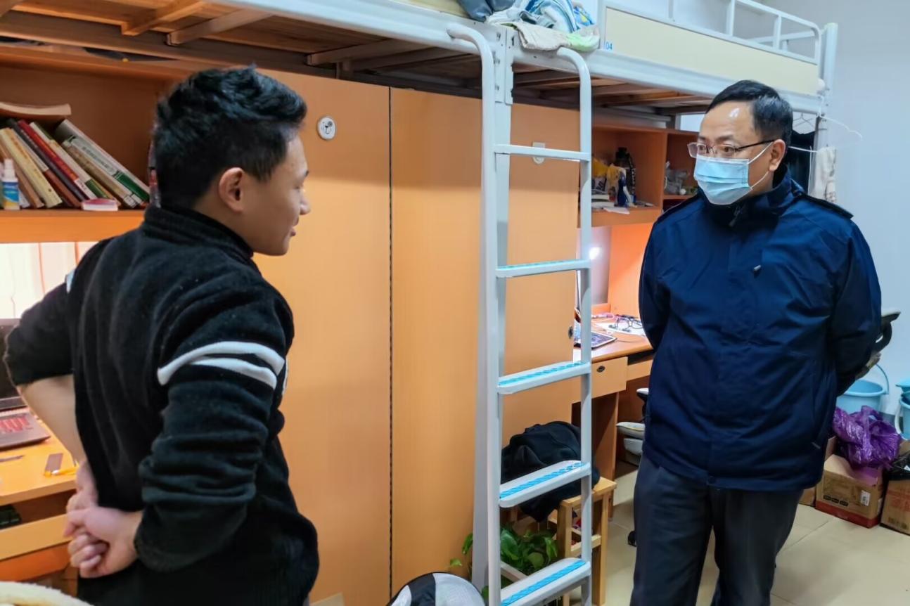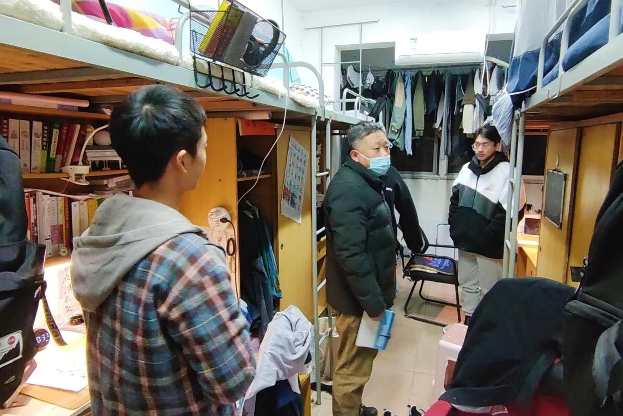 老师们对学生宿舍进行细致地安全及卫生检查,并说明宿舍里使用大功率电器、私拉电线的危害,叮嘱学生注意宿舍用电安全 保持寝室卫生,养成爱干净的好习惯。“冷不冷呀?多加衣服哟!”曾志东关心地问着穿着单薄的同学,近期温度骤降,老师们询问学生保暖措施是否到位,学习和生活是否存在的问题。针对当前严峻的疫情形势,邓辉反复提醒同学们非必要不出校,提高防疫意识,注意自身健康安全。老师们细心叮嘱,学生们积极回应,寝室内一片欢声笑语。