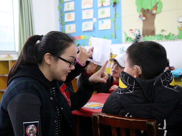 已经在特校工作了一个多学期的许老师对每个孩子的情况都极为了解,也熟悉志愿者们的服务工作。关于孩子们的学习情况,她介绍,这些孩子都是先天性失聪,不像一般孩子那样能够很快掌握发音方法,所以每天要教他们练习发音。而只有对这些孩子进行专门的发音训练,才能在他们长大以后尽可能无障碍地适应社会生活。许老师说:“比如瑶瑶和乐乐这对双生姐妹,一开始她们的父母将她们送到了幼儿园,但是发现由于语言交流困难以及性格内向,两姐妹不能很好地适应学习环境,送到特校以后,通过系统的练习才能渐渐开口说话。”