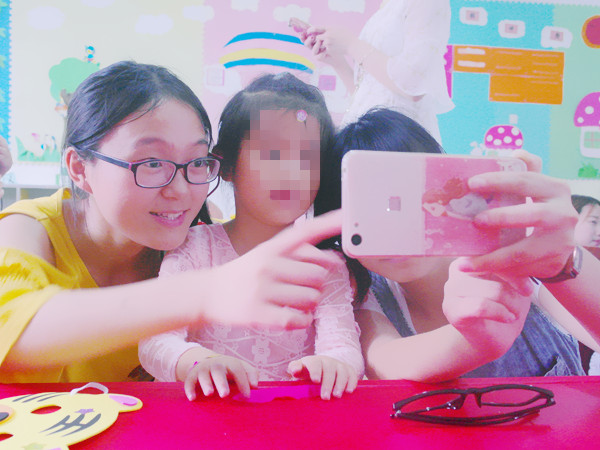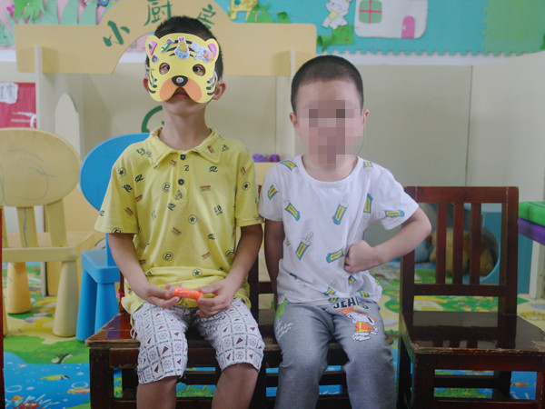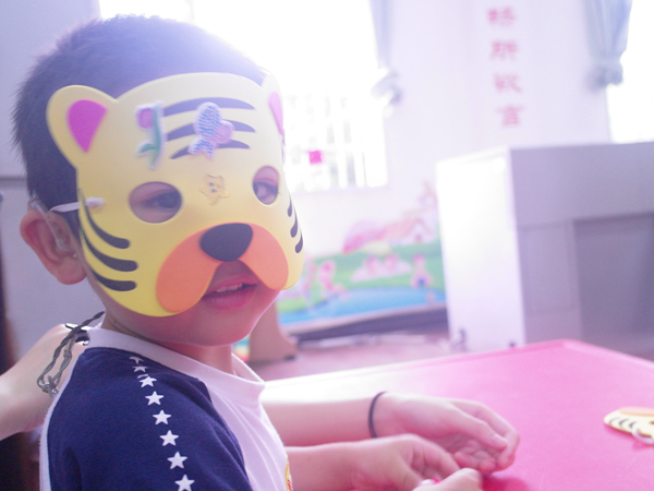特校的负责人刘老师维持好纪律后,志愿者们便进入班级中,和孩子们亲密地打起招呼来。志愿者杨玉婷负责的是刘梓杰小朋友,虽然是第一次见面,但刘梓杰却并不胆怯,很快和杨玉婷熟悉了起来。游戏开始之前,志愿者们亲切地搂着小朋友们,与他们一起拍照。这次志愿活动,志愿者们带来了四个游戏,分别是“猜猜这是什么”、石头剪刀布、贴鼻子和辨认卡片。志愿者们一对一地带着孩子们做游戏,领取奖品。刘梓杰小朋友在游戏中拿到了一个老虎面具,他非常开心地戴上,并向志愿者杨玉婷展示自己得到的面具。