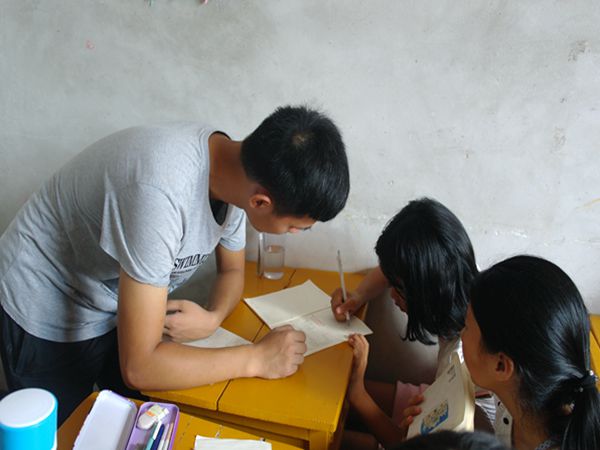 四、五年级的课堂上,孩子们正在学习分数除法,他们把老师布置的题目誊抄在作业本上,字迹整洁而工整。计算时,他们轻声地念叨着题目,聚精会神地埋头作答。“老师,我写好了,给你看!”迅速做好的孩子们高高地举起右手,左手则将作业本递到老师面前,满脸期待地望着老师,获得肯定后,又接着做下一题,眼神里流露出自豪与满足。“‘长河落日孤城闭’这句勾勒出一派壮阔苍茫的边塞黄昏景致,夕阳西下,绵延千里的戈壁,无边无际的大漠,一座孤城镶嵌其中。”在赏析范仲淹作品《渔家傲》时,志愿者李煜向初三班的孩子描述出一幅别致的画面。他用理解与记忆相结合的方式,要求孩子们准确默写诗词。