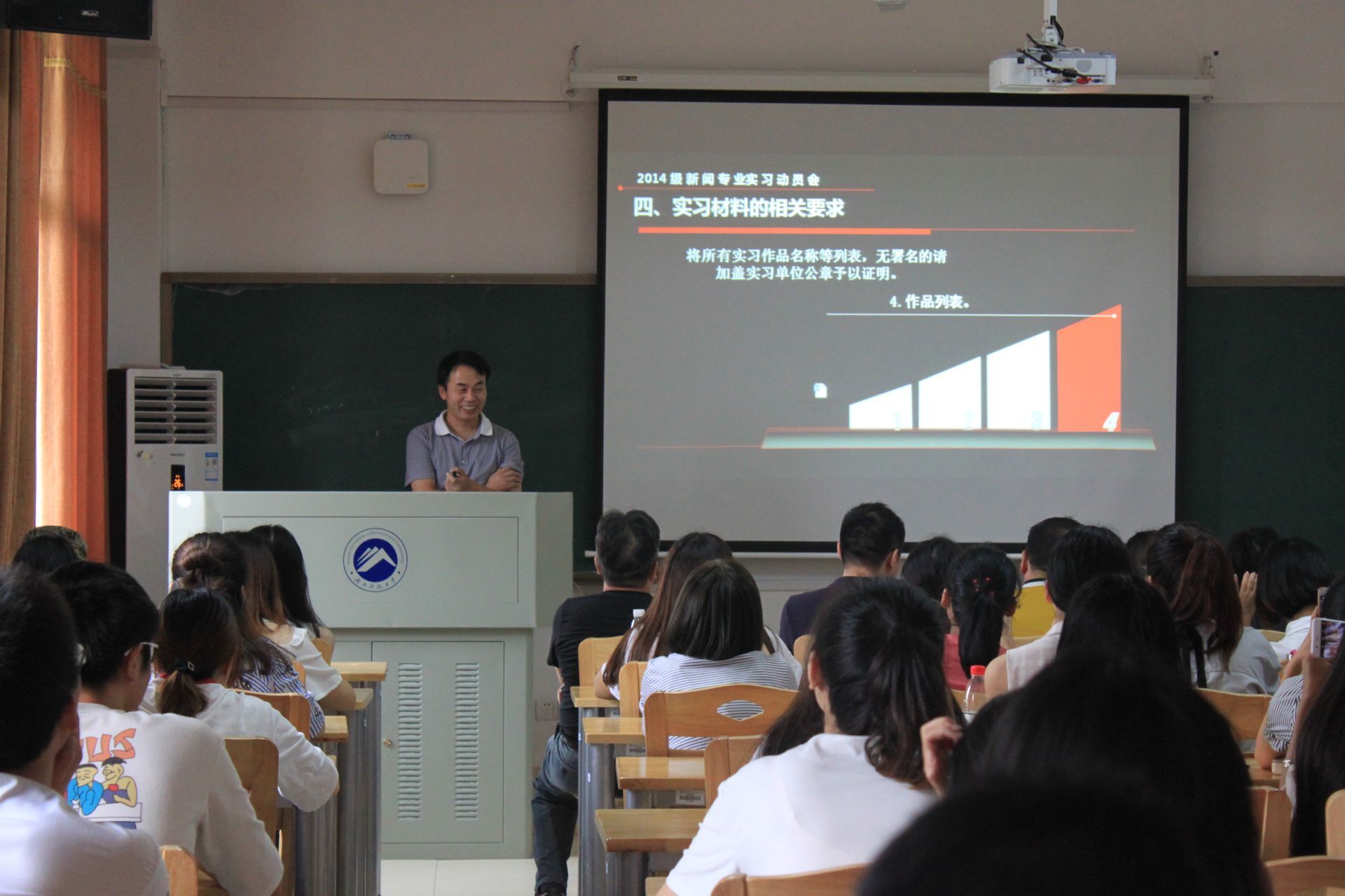 “与往届实习相比,今年2014级新闻专业实习点由省内不断向省外延伸。”会上,陈功总结道。此后,他以PPT形式对需上交的实习材料、《毕业实习规约十条》、《实习指导老师责任》做出了详细解释,同时,他表示学校将不断扩展省外实习点,为新闻学生提供一个更宽阔的实践平台,进一步扩大学校新闻专业的知名度和影响力。