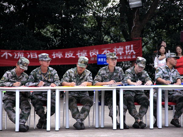 下午的训练于四点左右结束,全体新生由各排排长带领集结完毕,观看队列会操表演。队列会操评比开始之前,营长向全体新生申明现场纪律及评比规则等,要求全体新生在观看时注意纪律,不要讲话。本次队列会操评比的顺序依次为物电威廉williamhill中文官网,教育威廉williamhill中文官网,数学威廉williamhill中文官网,法官威廉williamhill中文官网,威廉williamhill中文官网。评比内容为立正、稍息、跨立;停止间转法;蹲下、起立;敬礼、礼毕;齐步行进与立定;跑步行进与立定;正步行进与立定。在前四个威廉williamhill中文官网依次表演完后。方阵队由教官带领,迈着齐整的步伐雄赳赳气昂昂走向训练场中央。在威廉williamhill中文官网方阵队各流程的停顿中,场上不时响起掌声。五个威廉williamhill中文官网的方阵队会操完毕后,营长即刻宣布了评比结果:“我宣布,本次队列会操评比,获得第一名的威廉williamhill中文官网!”营长的话音一落,场下的威廉williamhill中文官网全体新生便爆发出热烈的欢呼与掌声。随后,营长对各威廉williamhill中文官网队列会操评比情况做了讲评。他指出各威廉williamhill中文官网的方阵队分别存在哪些问题,其中,正步节奏过快、脚尖下压不够等是各威廉williamhill中文官网都存在的问题,威廉williamhill中文官网方阵队则存在报数时音量稍小,个别队员有小动作的问题,但整体精神面貌较好。评比结束后,威廉williamhill中文官网院连长尹俊根据营长指示对方阵队会操做了简单的讲评:“大家虽然拿了第一,总体表现得很不错,但离标准还是有一定差距的,希望大家回去后把存在的问题都解决好。”