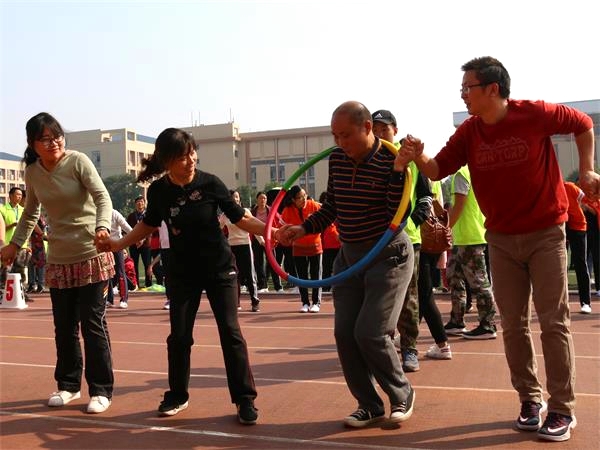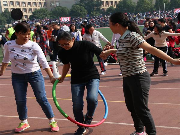 接到规程后,威廉williamhill中文官网老师积极采取行动,充分做好了思想动员和落实工作,迅速组成了约30人的教职工队伍,抓紧训练,在田径场上一展风姿。比赛前,现场的老师们就开始进行如火如荼的准备工作。一声哨响后,比赛开始。首先进行的是教职工“蛟龙出海”比赛,各队队员排成一排,相邻队员腿部由透明胶带绑牢固,比赛开始后,各队队员集体前行。以全体成员躯干到达终点的顺序决定排名。各位教职工你追我赶,以百倍热情参与其中。接下来是教职工“快乐传递”比赛。教职工们互相勾住肩膀站成一排,将呼啦圈从队首第一个人传递至最后一个人,用时最短者获胜。老师们拉紧双手,凭借默契的配合达到最理想的比赛结果。最后进行的是教职工“同心协力”比赛,即跳长绳比赛,比赛八人一组,两人摇绳,六人齐跳。六人同时起跳开始计数,两分钟后结束。开赛前,队员们跃跃欲试,进行热身准备,并按身高排好位置,目不转睛地关注着摇绳队员的节奏。在“1、2、3……”的口号中,队员们竭力把握节奏。难免失误时,队员们也不灰心丧气,而是互相鼓励,在迅速稳定后,继续去适应团体的整体节奏,以合作互助诠释了“同心协力”。取得胜利的小队欢呼雀跃,拍手庆贺。教师们配合默契,你下我上,激烈有序,赛场上留下了教师们的飒爽英姿。