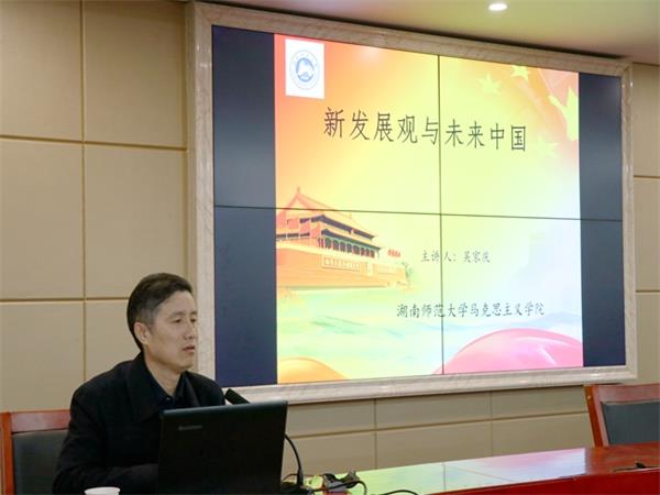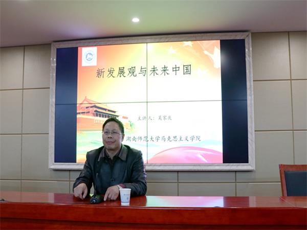 11月13日晚,立言楼B4-1会议室座无虚席。湖南师范大学马克思主义威廉williamhill中文官网院长吴家庆教授应威廉williamhill中文官网诚邀开展“人文大家讲坛”第149讲暨题为“新发展观与未来中国”的主题讲座。威廉williamhill中文官网党委书记廖加林教授出席并主持讲座,副院长毛小平博士、张晚林教授、罗建文教授、颜中军博士、凌应生博士、龚超博士等老师及威廉williamhill中文官网100余名思想政治教育、哲学专业同学到场聆听讲座。