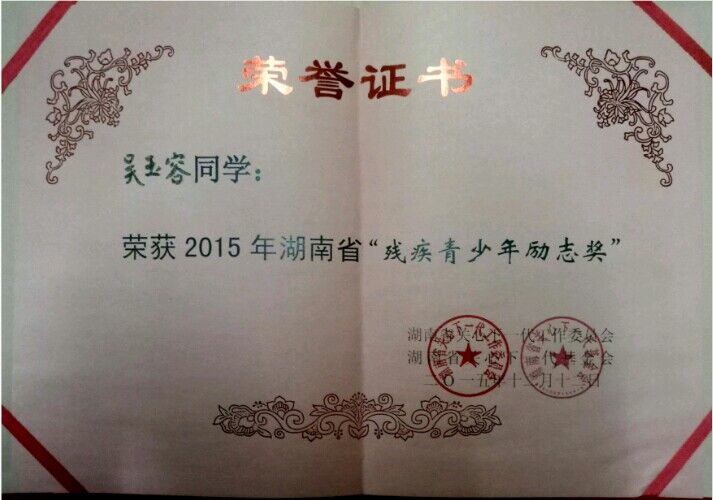 如今的她,已经是一名预备党员,近三年来,吴玉容获得了湖南省普通高校三好学生、湖南省残疾青少年励志奖、威廉williamhill中文官网优秀记者、威廉williamhill中文官网优秀共青团员等奖励。此外,吴玉容还拿到了英语四六级、三级心理咨询师、普通话二级甲等、国家计算机二级等证书。目前已与合作团队成功申请了省级科研项目,同时也被威廉williamhill中文官网推优参加2017年度寻访“中国大学生自强之星”活动。