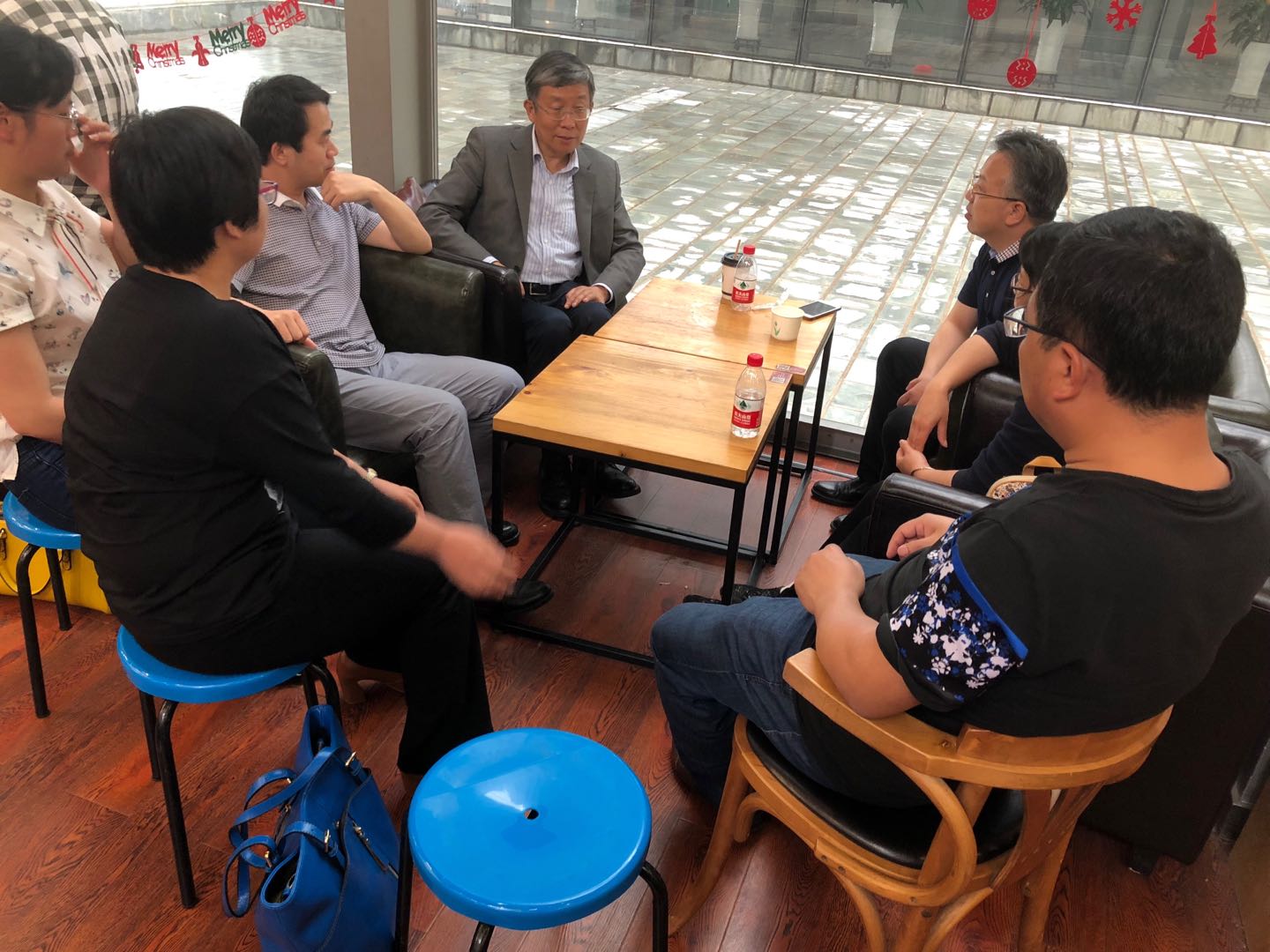 (老师们在听取辜晓进教授介绍毕业设计经验)