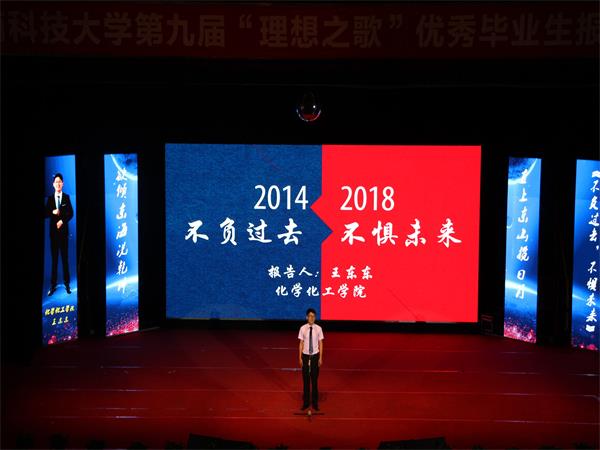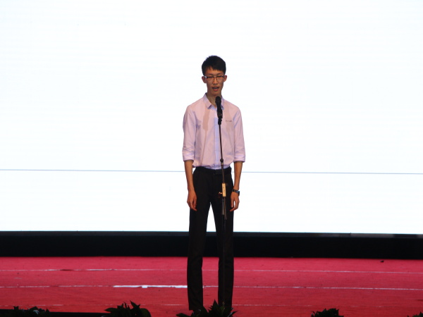 化学化工威廉williamhill中文官网的王东东,一上台,就分享了一个故事。一个正打算半夜翻学校围墙去网吧玩游戏男生,却看到来送生活费却舍不得住旅馆而因此在墙角休息的父亲,自此发奋努力,成功逆袭。在大一沉迷各种游戏的他,认为大学四年那么长,挥霍一下也无妨,在看到这个故事后,深感惭愧,幡然醒悟。他认为只有不负过去,不惧未来,才是最好的方式。与科研的好奇与兴趣同行,他曾整日浸泡在实验室,曾见过凌晨三点半的科大,曾为国际专项赛苦练英语……他相信余生漫长,不必慌张,认真踏实做好每一件事,一定能等到岁月的回馈。
