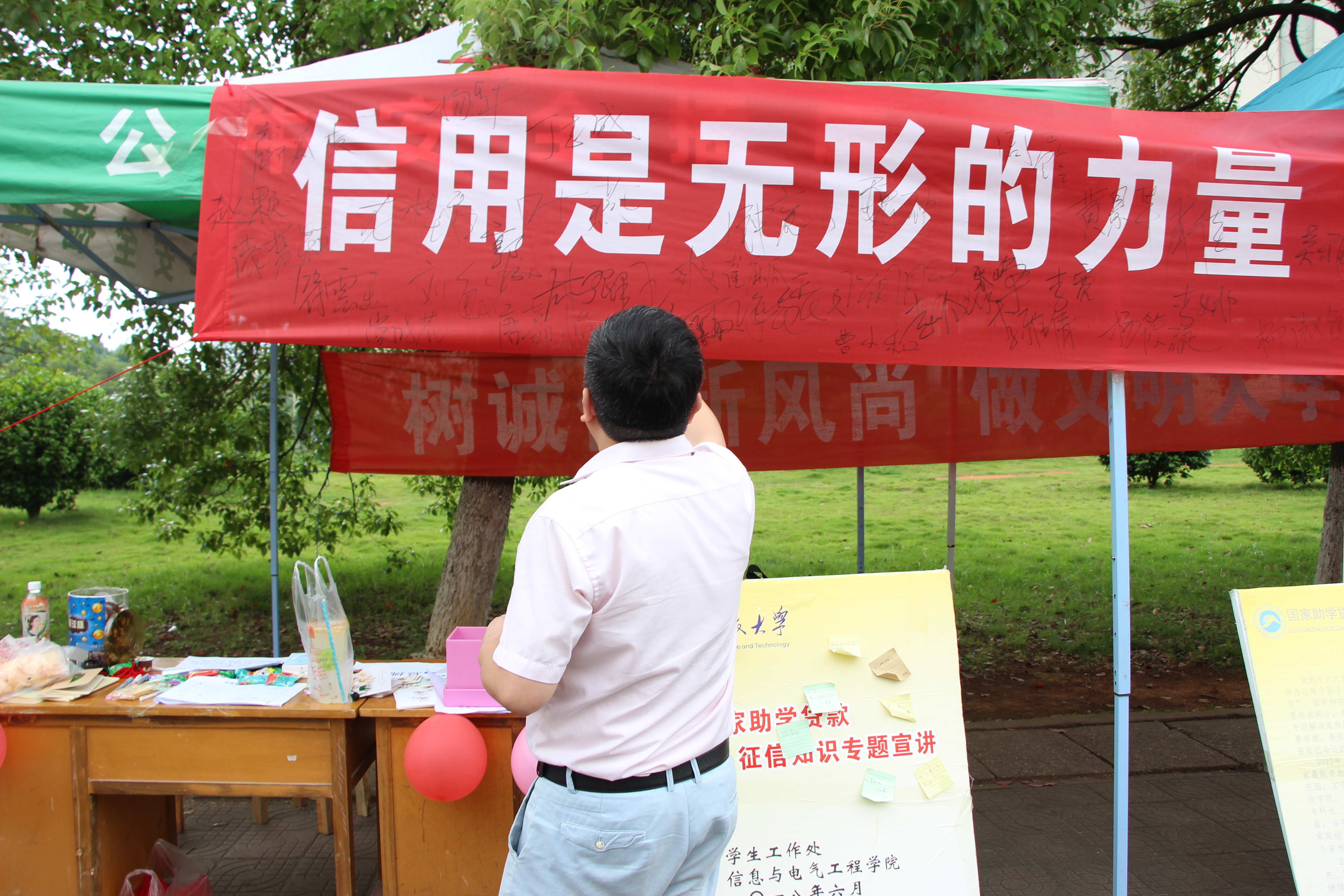 此次活动以“诚实,道德之基;守信,和谐之源”为主题,面向14级贷款学生,威廉williamhill中文官网贫困生及其他大部分人员。活动寓教于乐,设置四个小游戏让同学们参与,并设有奖品,同时,向同学发放诚信读本,采访他们对诚信的认知与理解、实践状况,做好笔录,邀请他们在横幅上签字、写诚信三笔字。